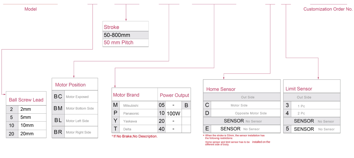 | Verwendungsort | Fahrmodus | Modellspezifikation | Motorleistung (w) | Breite (mm) | Wiederholbarkeit (mm) | Kugelgewindetrieb-Spezifikation | Maximale Nutzlast (kg) | Höchstgeschwindigkeit (mm/s) *1 | ||