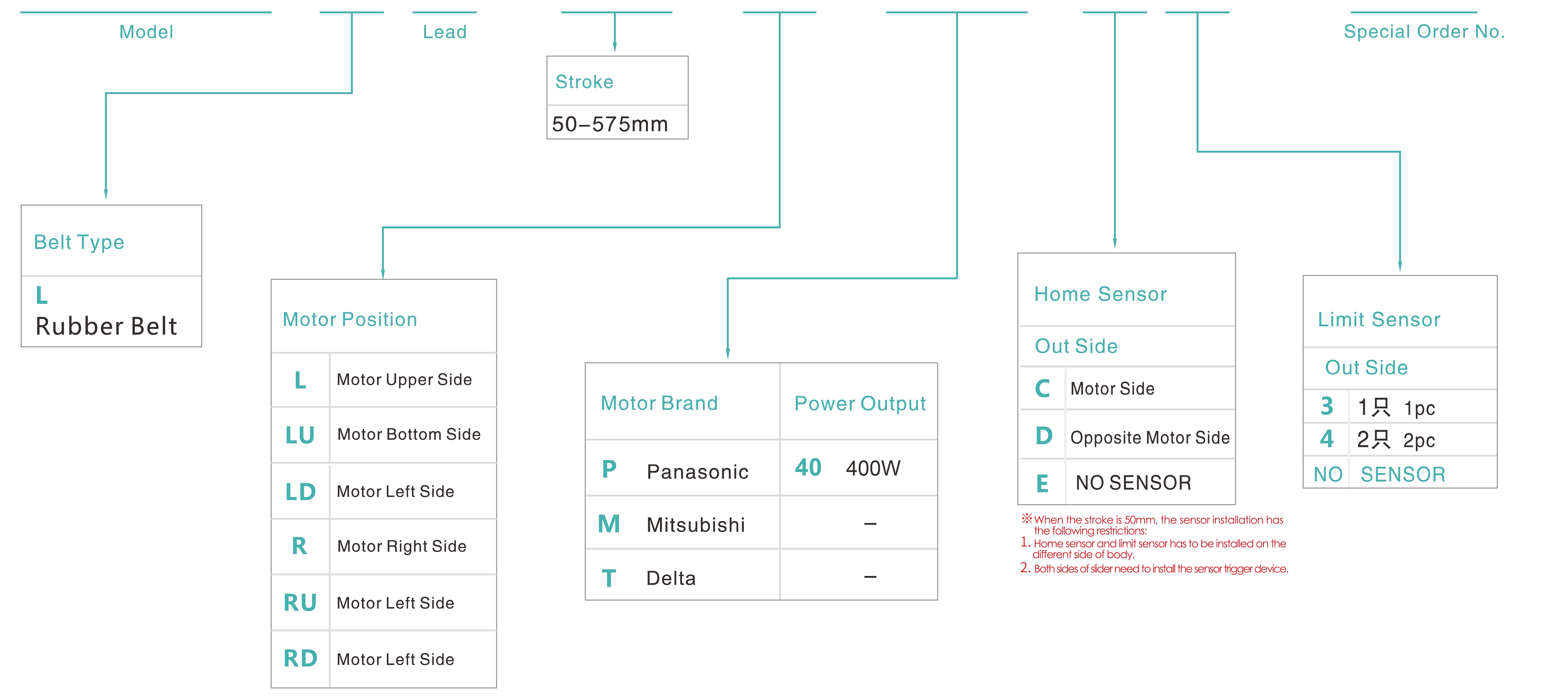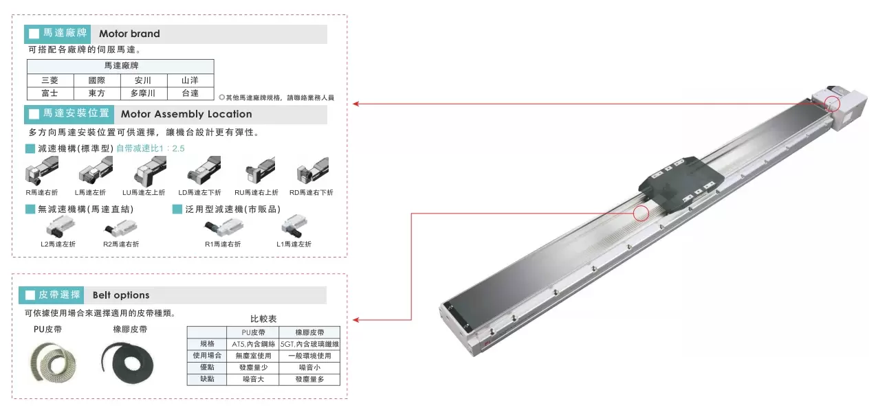| Verwendungsort | Fahrmodus | Modellspezifikation | Reduziermechanismus | Motorleistung (w) | Breite (mm) | Wiederholbarkeit (mm) | Riemenspezifikation | Maximale Nutzlast (kg) | Höchstgeschwindigkeit (mm/s) *1 | ||