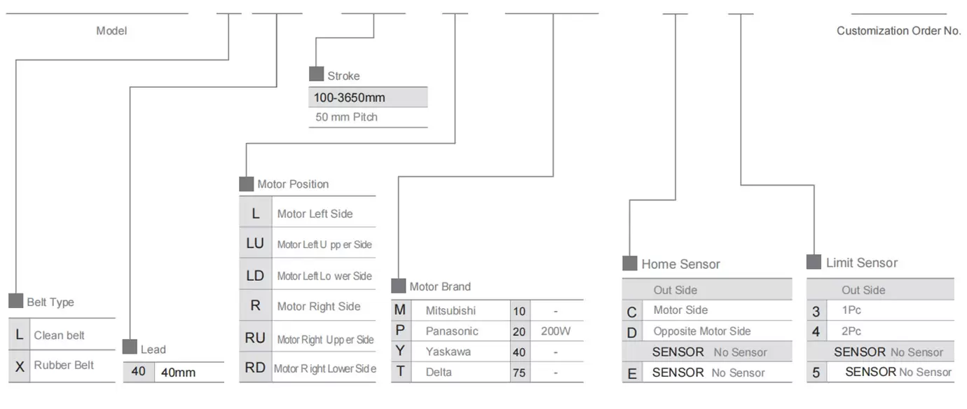 | Verwendungsort | Fahrmodus | Modellspezifikation | Reduziermechanismus | Motorleistung (w) | Breite (mm) | Höhe des Körpers (mm) | Wiederholbarkeit (mm) | Riemenspezifikation | Maximale Nutzlast (kg) | Höchstgeschwindigkeit (mm/s) *1 | ||