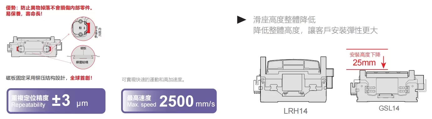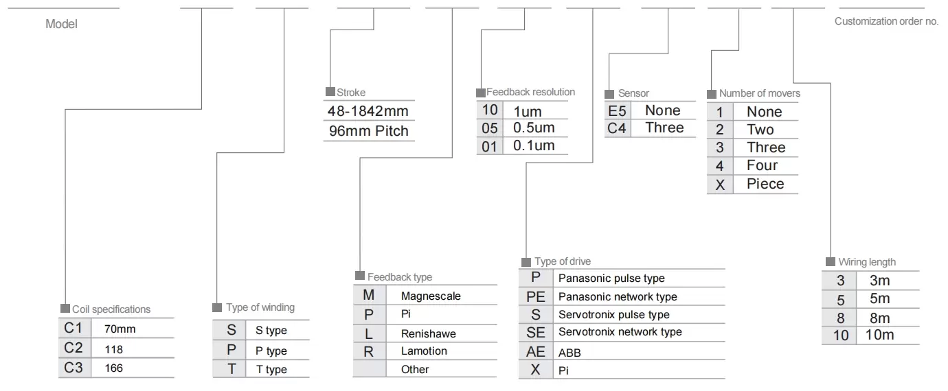 | Verwendungsort | Fahrmodus | Modellspezifikation | Motorspezifikationen | Die Breite des Körpers (mm) | Die Höhe des Körpers (mm) | Wiederholgenauigkeit (mm) | Kontinuierlicher Schub (N) | Maximaler Schub (N) | lrms(A) | Maximale Nutzlast (kg) | Höchstgeschwindigkeit (mm/s) *1 |