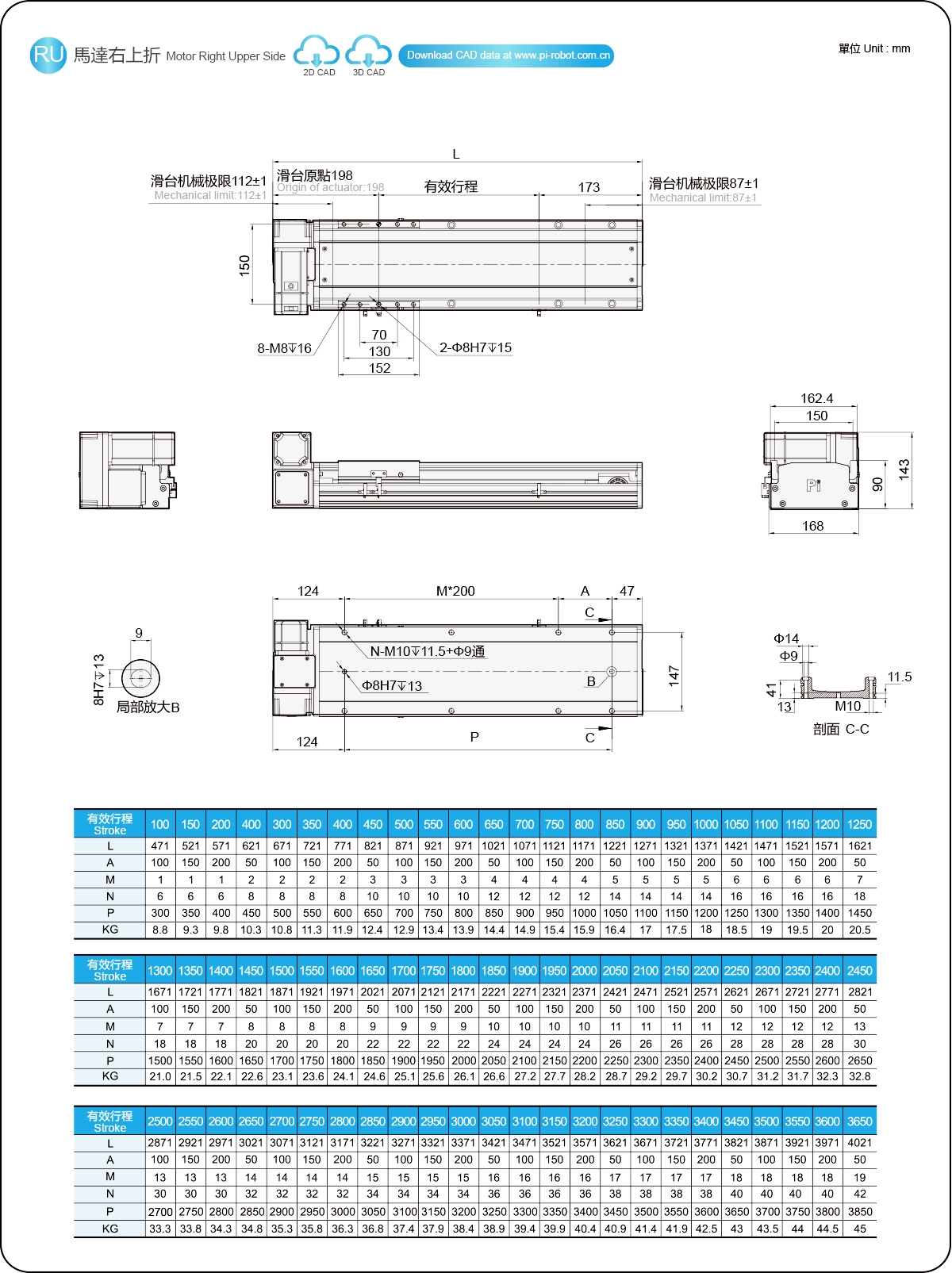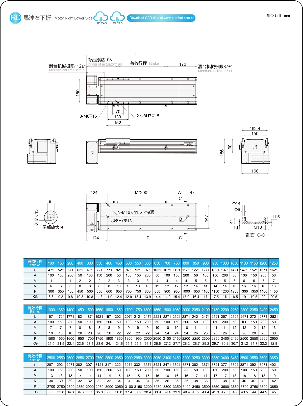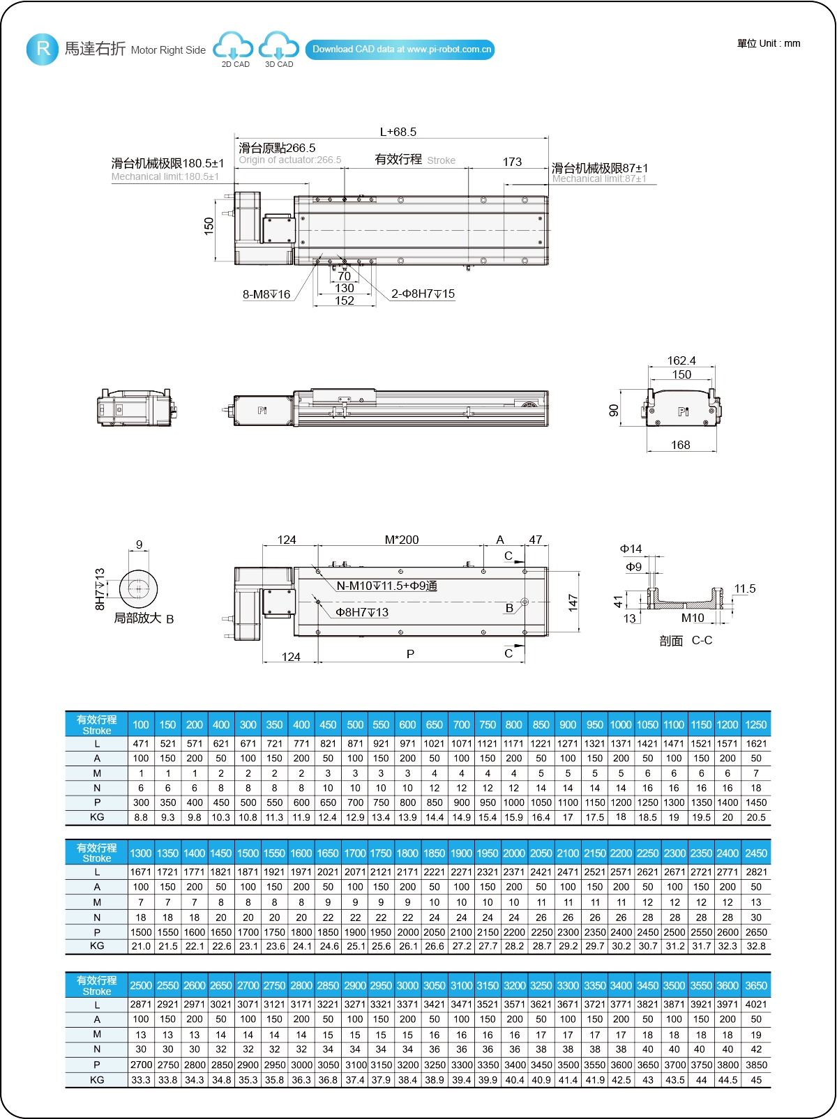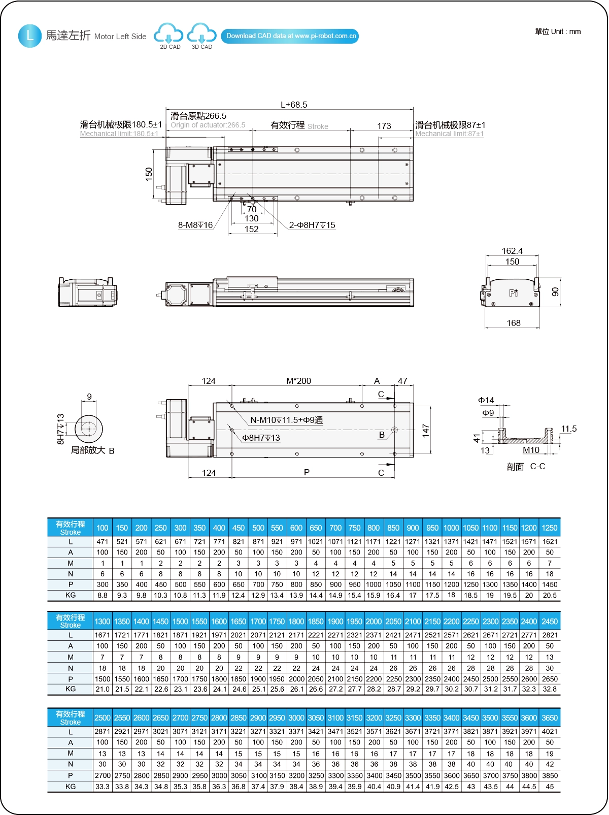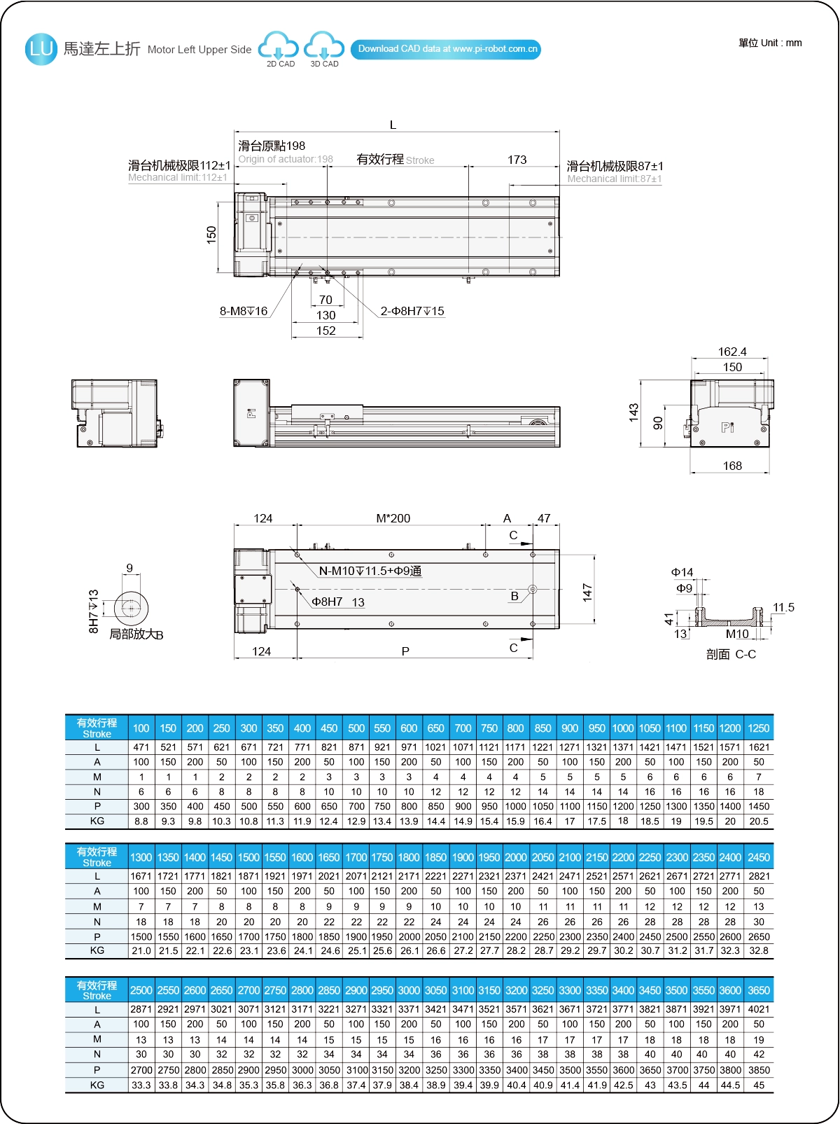 | Hubteilung (mm) | 100-3650 mm / 50 mm Steigung | ||