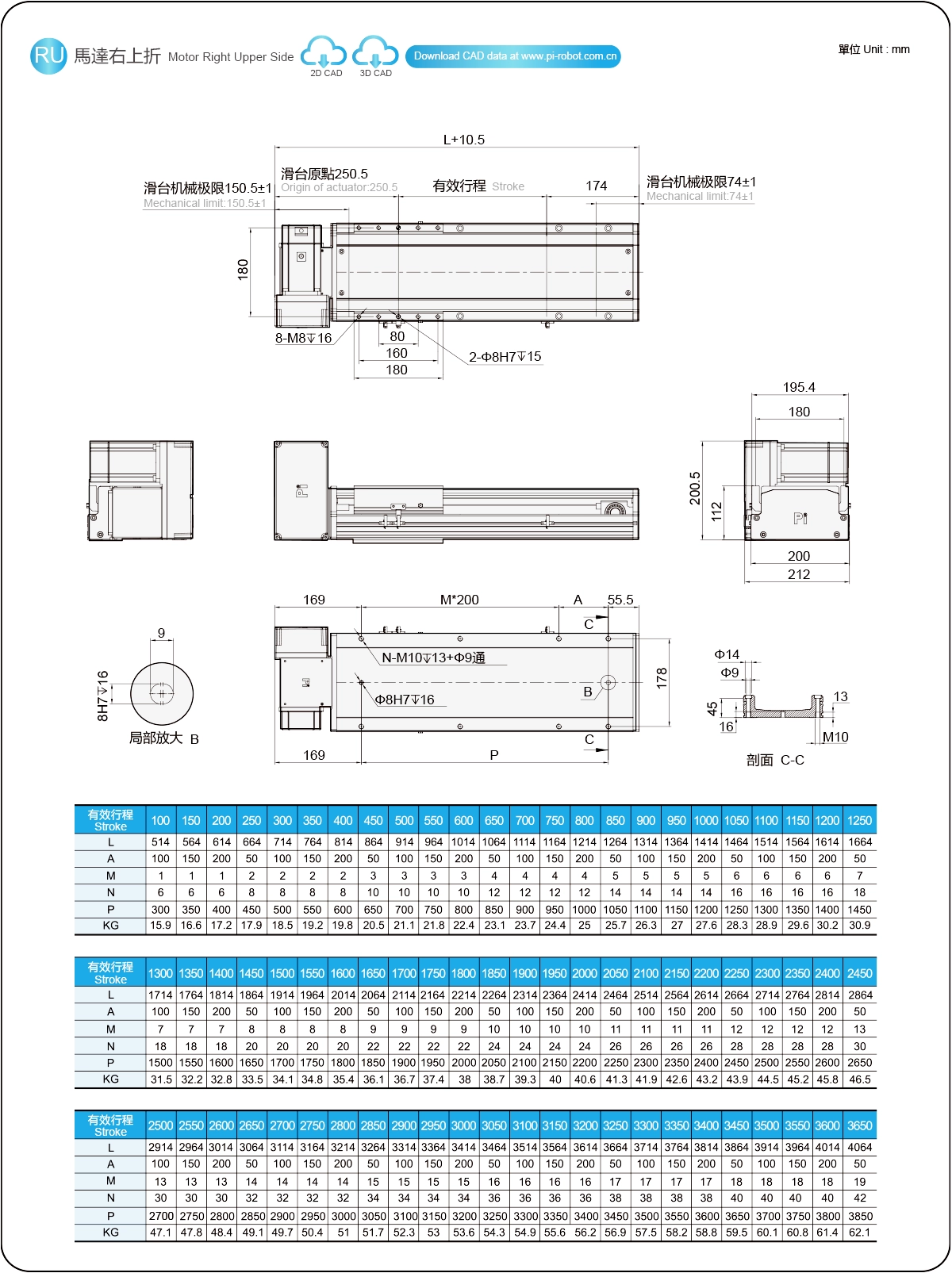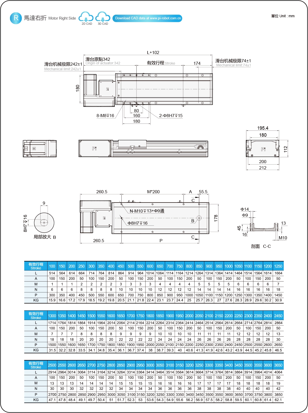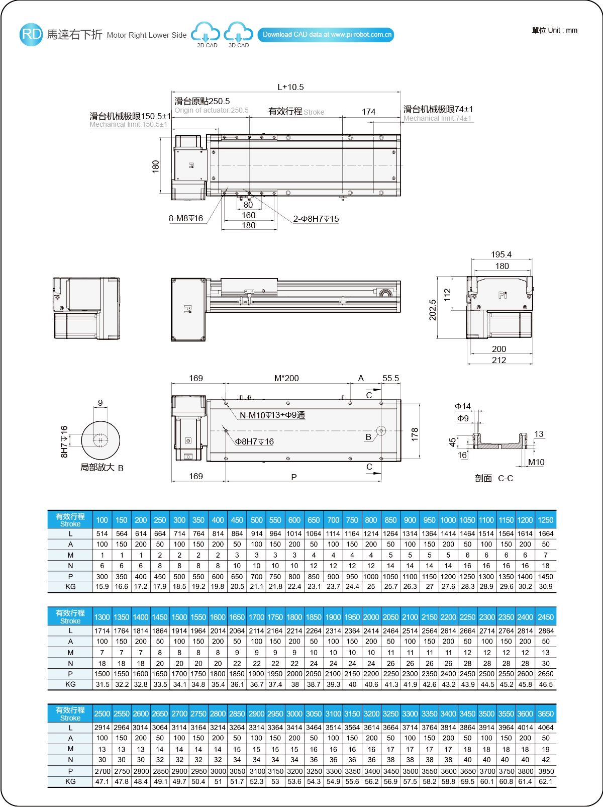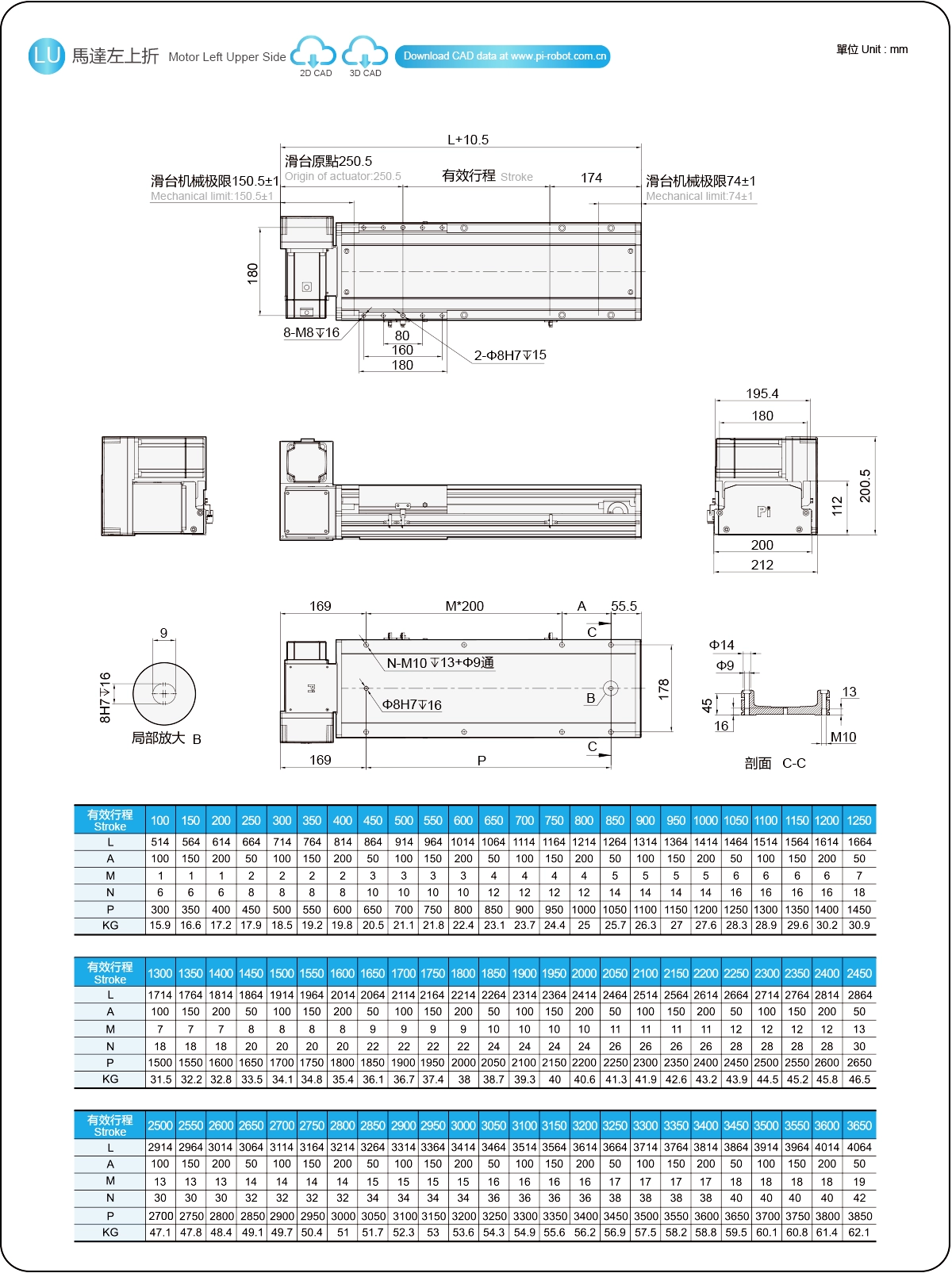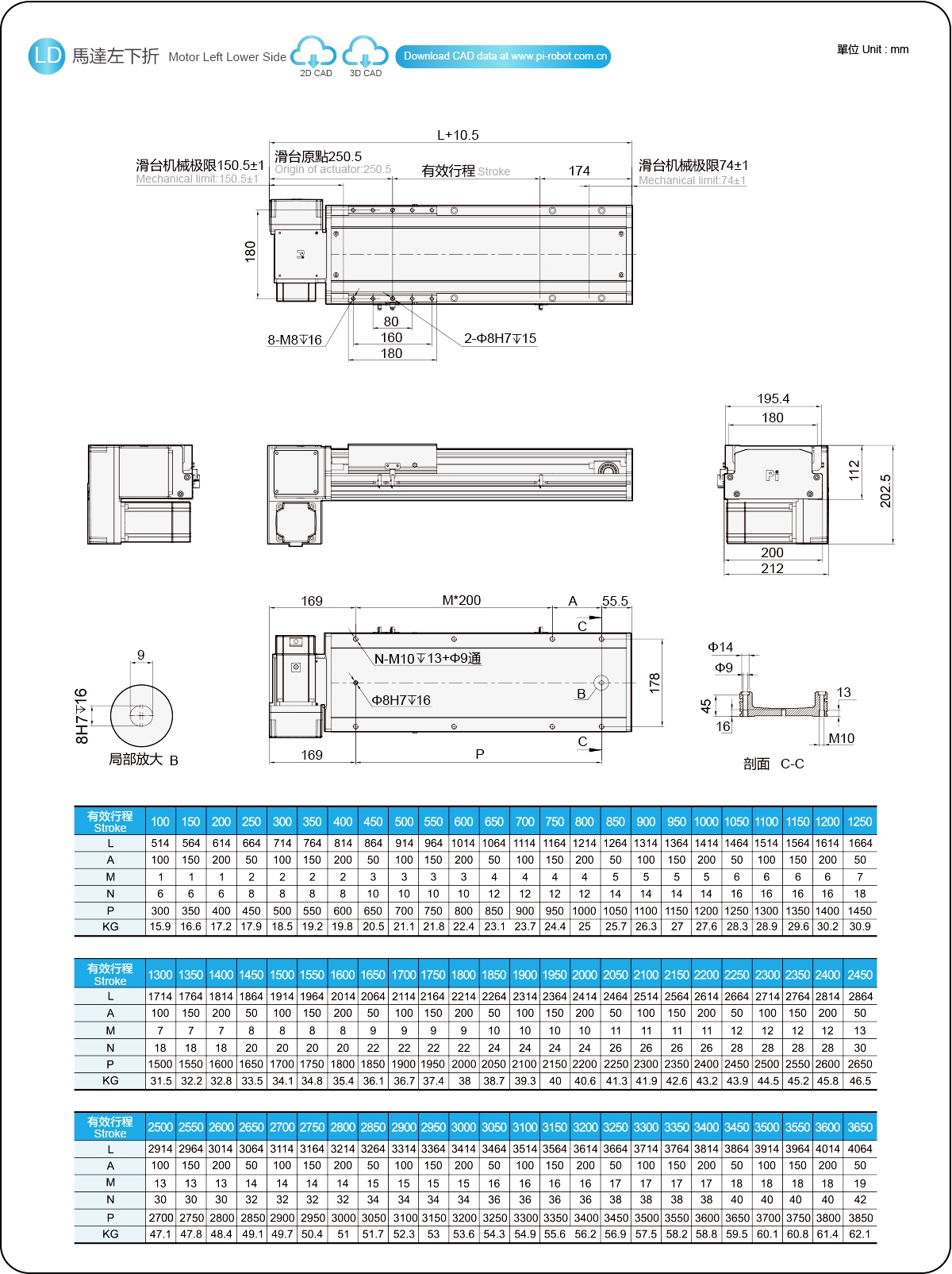| Hubteilung (mm) | 100-3650 mm / 50 mm Steigung | ||