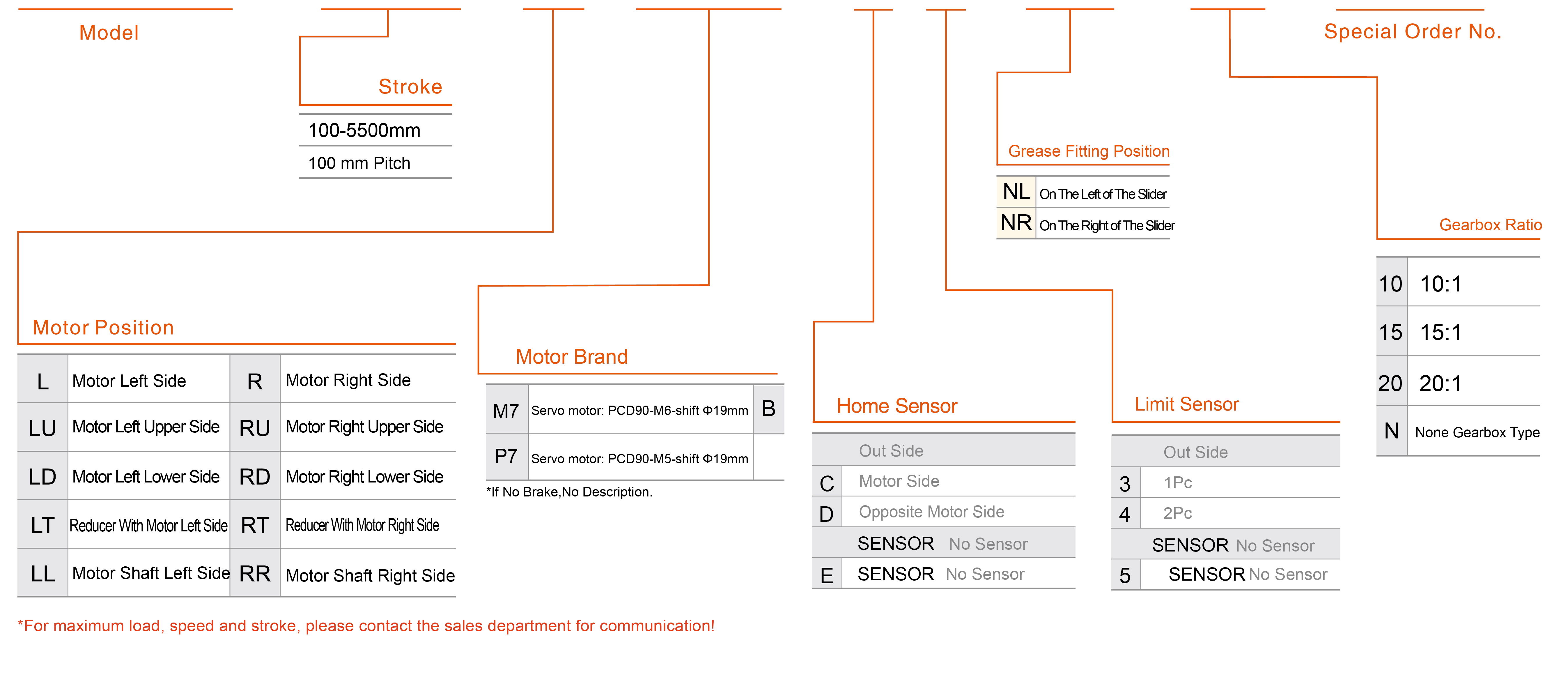 | Verwendungsort | Fahrmodus | Modellspezifikation | Reduziermechanismus | Motorleistung (w) | Breite (mm) | Wiederholbarkeit (mm) | Riemenspezifikation | Maximale Nutzlast (kg) | Höchstgeschwindigkeit (mm/s) *1 | ||