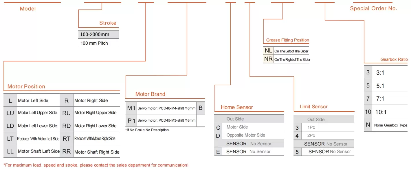 | Verwendungsort | Fahrmodus | Modellspezifikation | Reduziermechanismus | Motorleistung (w) | Breite (mm) | Wiederholbarkeit (mm) | Riemenspezifikation | Maximale Nutzlast (kg) | Höchstgeschwindigkeit (mm/s) *1 | ||