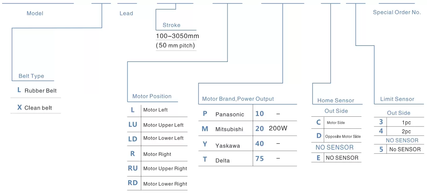 | Verwendungsort | Fahrmodus | Modellspezifikation | Reduziermechanismus | Motorleistung (w) | Breite (mm) | Wiederholbarkeit (mm) | Riemenspezifikation | Maximale Nutzlast (kg) | Höchstgeschwindigkeit (mm/s) *1 | ||