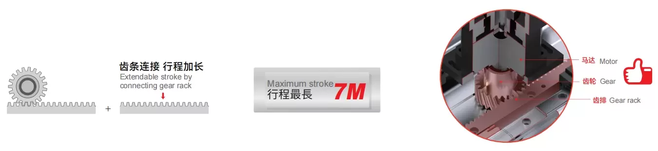 Durch den Einsatz eines Zahnradantriebs findet bei langen Verfahrwegen kein Spindelantrieb statt, und das Problem der Spindelwicklung tritt nicht auf. Die Getriebestruktur wird linear über die Zahnstange angetrieben.