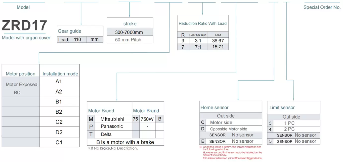 VerwendungsortFahrmodusModellspezifikationMotorausgang (W)Breite (mm)Wiederholgenauigkeit (mm)Das Verhältnis der VermindererSchrägverzahnungsgröße (mm)Maximale Nutzlast (kg)