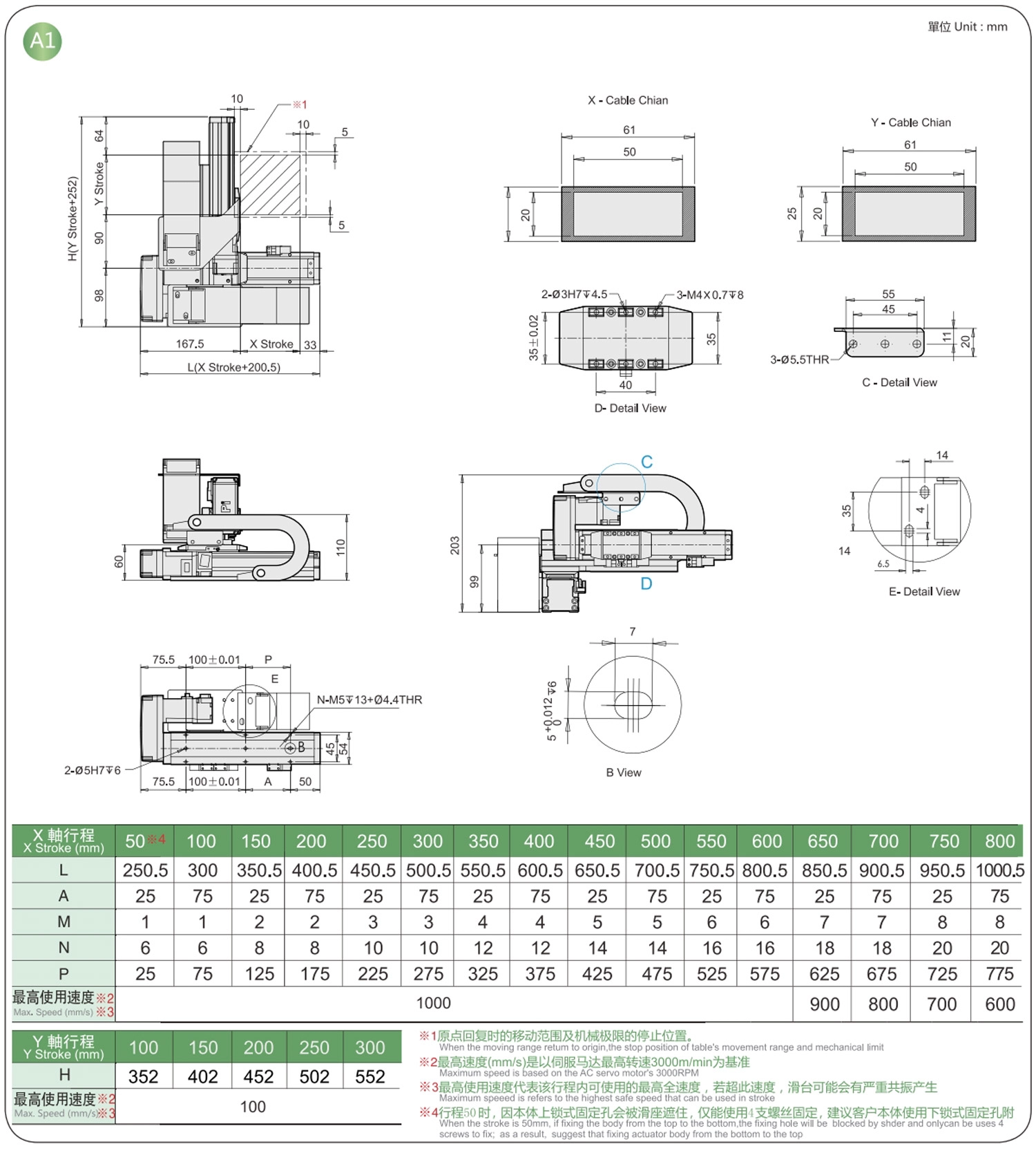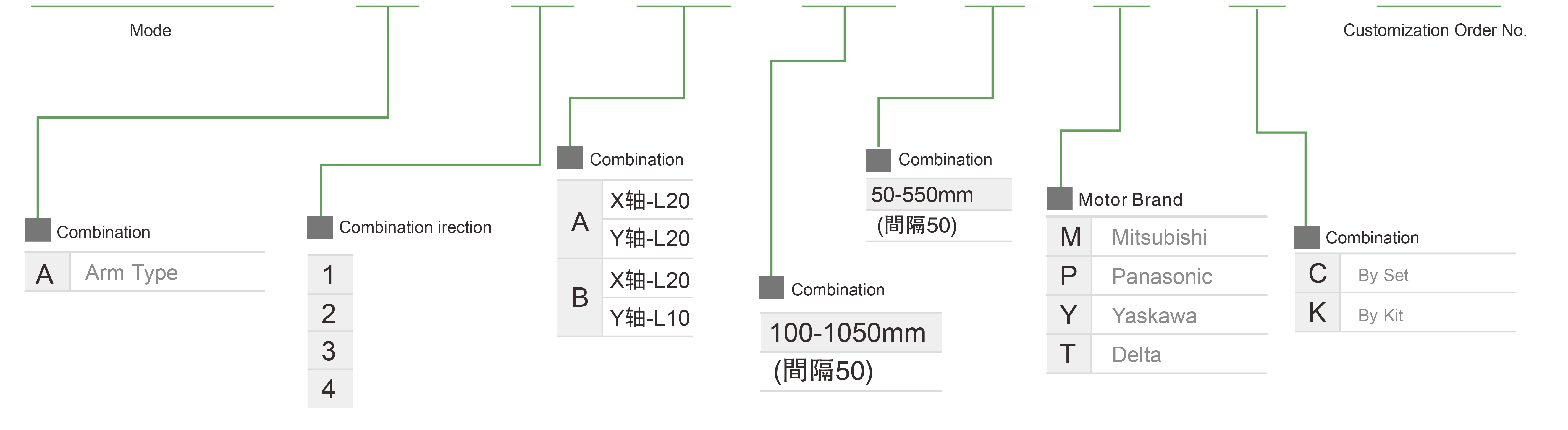 | Verwendungsort | Fahrmodus | Modellspezifikation | Kombination | Achsennummern | Führen | Höchstgeschwindigkeit (mm/s) | Hub (mm) | ||||||