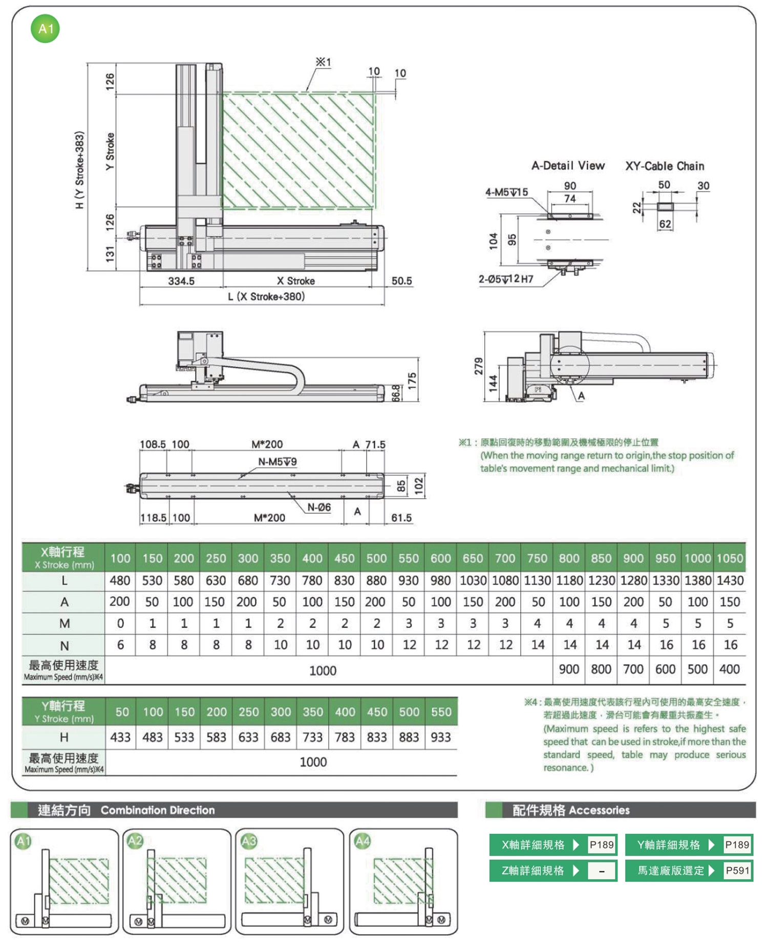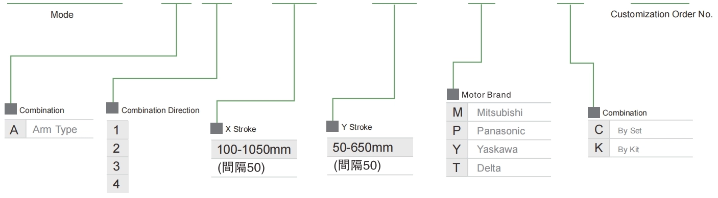 | Verwendungsort | Fahrmodus | Spezifikation | Kombination | Achsennummern | Höchstgeschwindigkeit (mm/s) | Hub (mm) | ||||