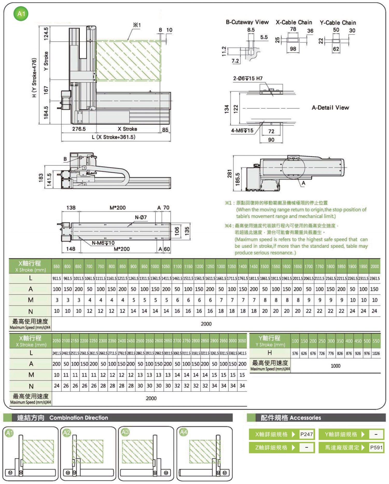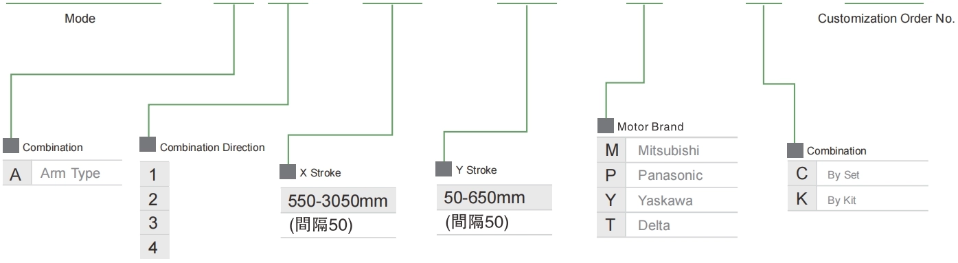 | Verwendungsort | Fahrmodus | Spezifikation | Kombination | Achsennummern | Höchstgeschwindigkeit (mm/s) | Hub (mm) | ||||